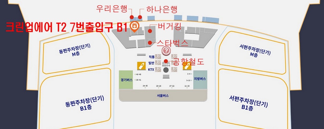 | 위치 | 인천공항 제2여객터미널 지하1층 크린업에어(3층 출국장과 1층 입국장 7번 출입구에서 내려가기) |